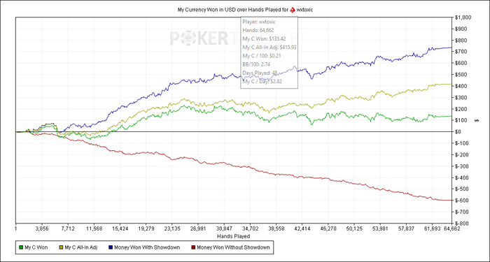 Всем привет!Меня зовут Максим.Ник на старзах wxtoxic. С покером знаком около 7 лет. Играю как оффлайн так и онлайн. В последнее время появилось больше свободного времени, решил катать регулярней . В общем за последние ~60к рук на NL10 мне недодало 28 бай-инов . В связи с этим было много тильта , злобы и т.д. Но, я тут не для жалоб. Решил провести марафон . Что бы марафон был интересней решил стримить . https://www.twitch.tv/wxtoxic Во первых я хочу начать с нижнего лимита , то есть с NL2 .Для того , что бы потеря 1-5-10 бай-инов никак не ударяла по нервам .Так же , как и недодача по EV. Во вторых , хочу натренировать свою усидчивость и сконцентрированность .То есть на каждый рабочий день , неделю и месяц есть определённая цель. В третьих , стримить , - это что-то новое для меня , поэтому это дополнительная мотивация . Цель марафона : Отыграть 100к рук на NL2 с 15EVbb /100. Я считаю эту цель довольно скромной , но достижимой .Учитывая тот факт , что я никогда не играл долгими сессиями.