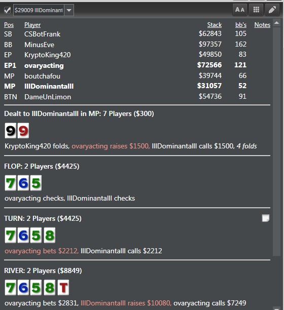 Тоже верно! Сейчас колл мне нравится больше, так как не могу придумать блефы по риверу для ререйза. По этому, даже не смотря на бет всего в 30% - колл был бы хорошим решением.