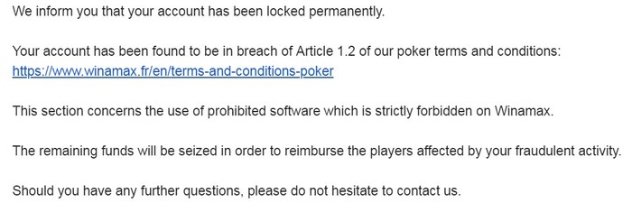 If any fraud is detected (such as the use of a forbidden software, for example), Winamax will use any means necessary to preserve the integrity of the game. These measures include sanctions towards the offending player and can lead to the definitive closure of the Winamax account along with the confiscation of funds of the offending players.