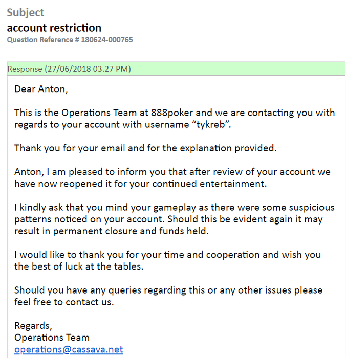 This is the Operations Team at 888poker and we are contacting you with regards to your account with username “tykreb”.
