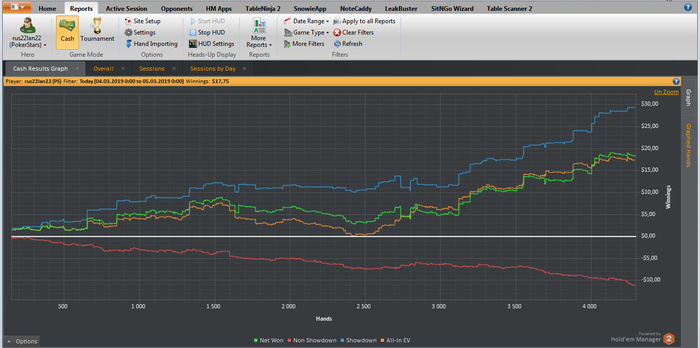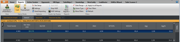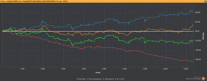 CloudGeo, Привет! катаю два года на PS, играть до недавнего времени не умел. Сначала катал на кэш-столах, но показалось что медленно. Сейчас перешел на зум, катаю два стола. Откатал с НГ, 30-40к рук в минус, понабивал шишек. Понимание пришло с опытом. Сначала БР был 74bb, сейчас 69bb. Сессия за сегодня: