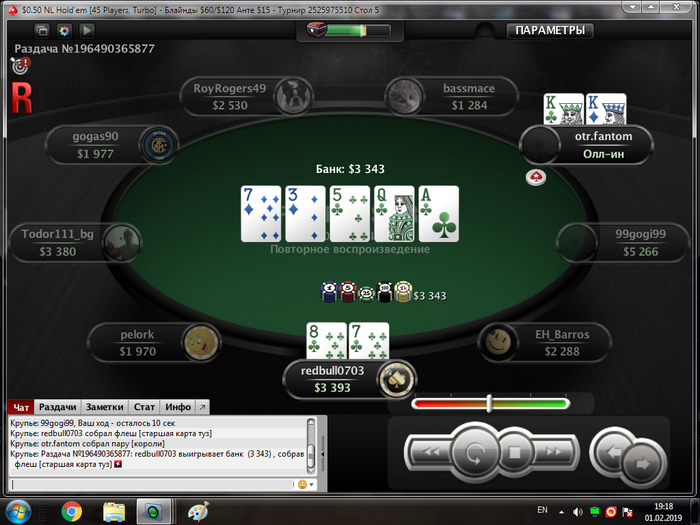 запушил в первом круге торгов и человек с К3 в масти заколировал ему с флопа положили Короля я не расстроился отметил человека и погнал катать дальше. Всем добра и хорошего настроения.))