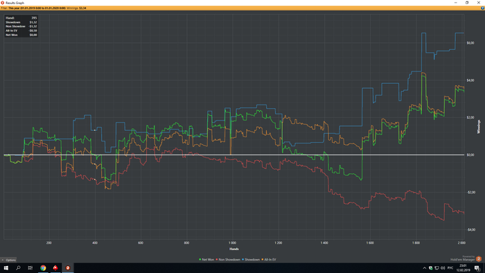 Всем привет. Решил создать дневник. Буду выкладывать результаты сессий и спорные раздачи. Играю NL2 с винрейтом 12bb/100 за 37к рук, пробовал перейти на NL5, но он встретил меня даунстриком(как мне кажется), слив там 9 БИ вернулся снова на NL2, так как осталось $50 БР. Ниже будут графики общие за NL2 и за сегодня. Цель - в этом году закрепиться на NL50. Надеюсь получиться. Играю по 6 рег. столов, в среднем по 2к рук в день