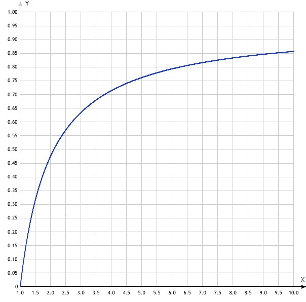 Второй вариант подразумевает, что вы вообще не разбираетесь в спорте и/или в ставках и ставите наугад. Тогда остается лишь принять вероятности исходов, заложенные в коэффициенты букмекером, за истинные. В таком случае единственное значение будет иметь выбор не конкретного исхода, а коэффициента. Например, для пятипроцентной маржи букмекера функция зависимости $ev от коэффициента (k) будет иметь подобный вид: $ev = (k-1)/k*1.05 . При бесконечно больших коэффициентах ваш выигрыш с каждого поставленного 1 доллара будет к этому самому доллару и стремиться, а для малых коэффициентов будет мизерным. Вот график этой функции для приближенных к реальности значений от 1 до 10:
