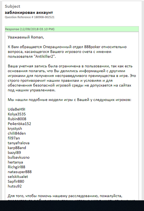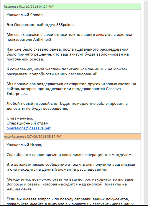 из всей переписки с ними я понял что подозрение могли вызвать мои действия в турнире "брейкфаст" если коротко то суть турика в том что играется определенное время (6 минут) после чего все игроки идут в авто-оллин. было несколько ситуаций когда последнюю раздачу я и мой оппонент играли максимально долго (раздача была довольно важная и мы тратили на раздумывания все время хода и весь таймбанк) естественно в это время все остальные игроки рубились в автооллине и вылетали, возможно этот факт СБ восприняла как умышленное затягивание времени для получения преимущества! но тут возникает логичный вопрос - если покер руму не хватило ума сделать синхронный старт автооллинов то почему игроки которые в последней раздаче "долго думают" записываются в мошенники и блокируются??? логично ведь было сделать по окончанию времени турнира режим ожидания всех игроков, а тут получается что из 30-ти игроков 4 стола (6-макс) уже в автооллине вылетают а на 5м столе люди долго играют последнюю раздачу и идут в автооллин позже чем остальные столы и за это прилетает бан...