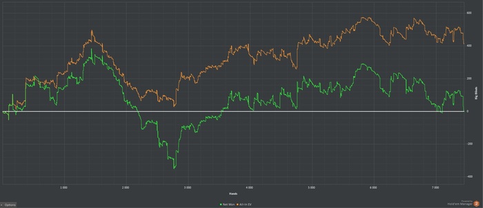 Цель 50к рук считаю я себе поставил не совсем верно. Не буду упираться в количество рук, а основываться на уверенности в игре и понимании ситуации. При достижении БР : 400€ буду шотить нл25 со стоп лосом 1.5 баина. Такой подход позволит не тратить слишком много времени на нл10. Не забываем про рейк и ценность собственного времени. Пока ситуация такая : БР : 260.21€