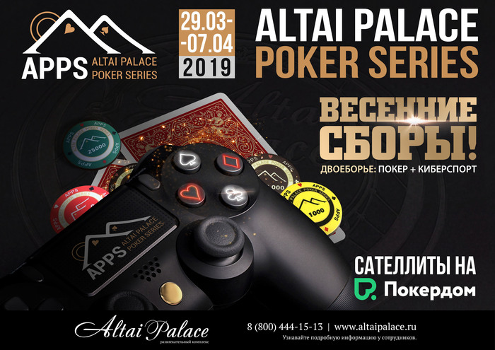 Вы уже успели соскучиться? Мы - да! Уже не за горами 2 серия 2 сезона "Altai Palace Poker Series", которая пройдет в игорной зоне "Сибирская монета", в развлекательном комплексе "Altai Palace" с 29 марта по 7 апреля 2019 года! Но теперь, в новом, уникальном формате: Покер + киберспорт! Такого еще никто не делал! На самом деле, у покера и киберспорта много общего. Многие профессиональные игроки в покер в прошлом были кибер-спортсменами и выступали на различных соревнованиях! У компьютерного спорта и спортивного покера схожая судьба - они были признаны нашим государством новыми видами спорта и затем теряли свой статус. Но киберспорту удалось вернуться в число спортивных дисциплин в 2016 году. Может и покер ждет второе рождение в нашей стране? Кто знает... Итак, что же нас ждет на очередной серии? В первую очередь - это встреча старых друзей, много общения и развлечений! Как всегда, хорошие турниры, с глубокой структурой и хорошей гарантией! Ежедневная кэш игра! Каждый день, по мимо турниров по покеру, вас будут ждать соревнования по киберспорту! Вы когда-нибудь играли в гонки или в футбол на огромном, 8ми метровом "телевизоре"? Теперь у вас появилась такая возможность! Огромный экран, мощный звук и удобная лаунж-зона! Наши фирменные пакеты и еще более расширенная акция "Компенсация за дорогу!" Отличные сателлиты у нашего онлайн партнера ПОКЕРДОМ, которые стартуют с 11 марта! Но давайте обо всем по порядку. Расписание турниров. Программа мероприятий Акция "Компенсация за дорогу!" Пакеты Бронирование пакетов через почту: poker@altaipalace.ru Звоните: +79635120110 (после 16.00 мск).