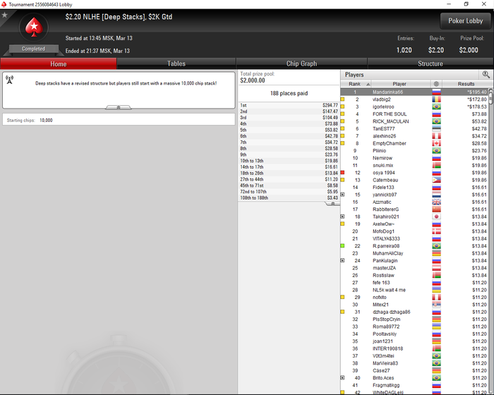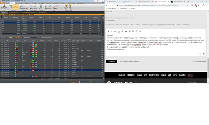 Привет! Ничего интересного не происходит, игра в последнее время особо не складывается, в дип раны попадаю редко и вместо того что бы нормально играть делаю всякую хрень. прикольно да сыграл в топ 50. зашли АА , ну конечно надо подставиться под сквиз от коротыша с бб, красавчик, сквиза нет, получил мультипот, хз что делать, остается сыграть как истинный Вот говорила мама : не вздумай слоуплеить тузов. ослушался и сразу наказан. Но это так, чисто немного по ныть() График с начала года. На бб прикольно в марте катаю, да?))