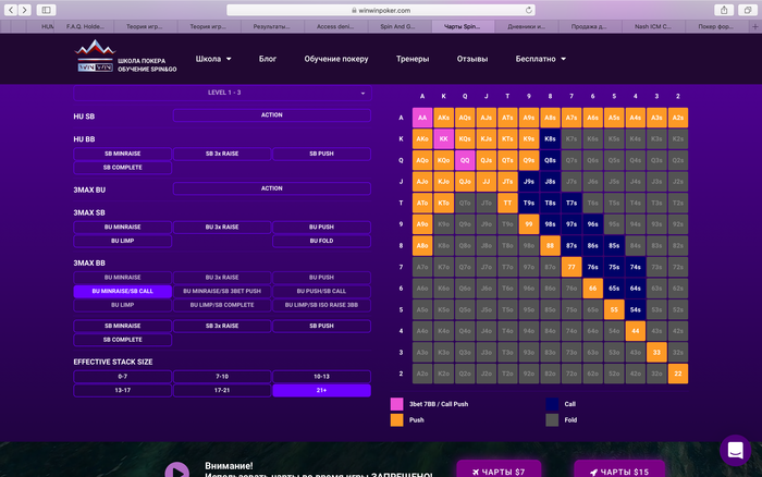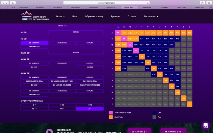 Недавно начал изучать покер, начал со спинов. Прошел 3 и 5-ки с чипЕв 66, сейчас перешел на 7-ки. Пользовался бесплатными чартами винвина для 3-ек, но сейчас они мне начитают казаться не совсем пригодными для моей игры. Низ диапазона отыгрываю в плюс, начал его расширять, но сэмплы на новые руки набираются очень медленно, поэтому оценить как я их играю пока сложно. Да и непонятно сколько рук добавлять? По одной или сразу по несколько? Например, диапазон защиты ББ в ХА кажется совсем тайтовым.