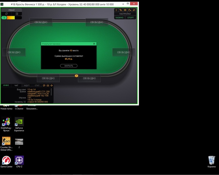 Из праздничного турнира вылетел,день в плюсе но тильтовал сегодня за столами, по К хай колил все три улицы и в таком духе весь день,на финалке тоже дичь творил 46о лимп/колл пуша с СБвсББ,игру где-то на 4/10 оцениваю.