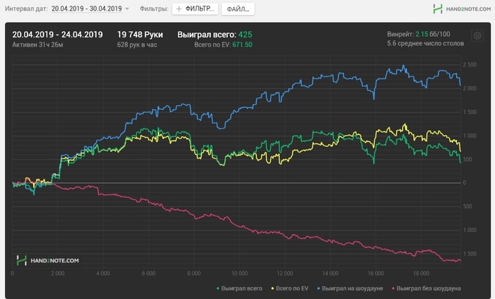 Сегодня не смог сыграть больше 5к рук. весь день повел с девушкой. Но и за эти 5к рук говна поел знатно. С одной стороны очень кайфово, что люди готовы платить в 3бетпоте 2 улицы совершенно не по шансам, пытаясь дотянуть свой гатшот(да да, сам удивлен) даже без оверкарт или стекаться префлоп на 100bb+ с QQ, AK а иногда и еще хуже. С другой стороны жопа начинает подгорать, когда они весь день ловят свои ауты, особенно когда у тебя за 50к рук итак недодача в 11 стеков скопилась.