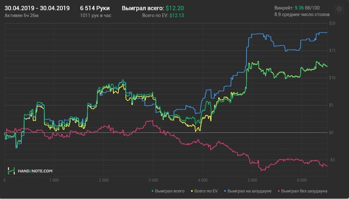 График за сегодня(H2N потерял где то последние 500 рук. Там примерно еще +1.5$ было)
