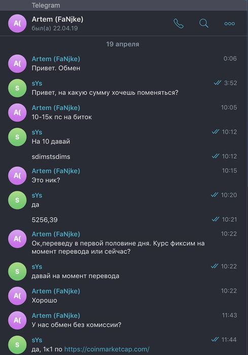 19.04 мне написал в телеграм @fanjkee и предложил поменять свои $10к PS на мои btc, я согласился и так как перевод был от него первым и пришел с ника FaNjkEEE, то я решил что он действительно тот за кого себя выдает и перевел ему $10к, выполнив свою часть сделки. (Да, я ошибся и нужно было проверить личность сообщением на ГТ, но я этого не сделал).