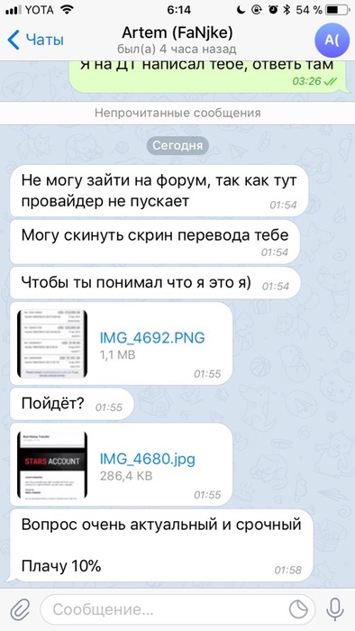 21.04 Мне снова пишет @fanjkee и предагает поменяться на $2к-$3к и предложив 10% с верху, но мне нужно будет перевести первым, потому что он якобы не может. (Сообщение уже удалено отправителем, но остался скрин когда он просит еще раз сделать это позже).