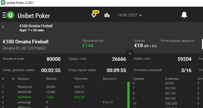 отыграл очередной день на пати пару миникешей, на юнибете неплохо складывалось бр пати 53.20 юнибет 68.37 32ред 2.59 итог 124.16 + 48.66 недоезд дня был в хедзапе по фишкам 1к 4 но все выставления мимо