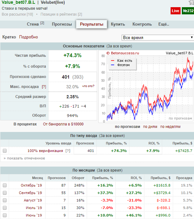 Очередной цикл завершён на 62 ставке ноября! Прибыль составила +1% ! На данном отрезке не удается сделать качественный рывок , но итоги за 2,5 месяца уже 227 ставок и выиграно 16 номиналов или 47% , что радует без больших просадок, не вижу проблем, что бы и в дальнейшем показывать такой достойный результат ! Оплата до понедельника 19.11.2019!