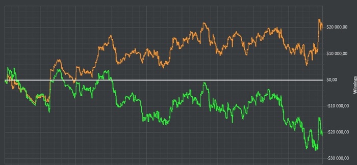 немного заметок: 1) до конца не понял еще, как распределить врем катушки. до 4 - 5:30 утра катать круто, но организму такой движ, несколько дней подряд, не очень нравиться. но игра днем не ахти - особенно есть играть нл50. Без миксов не обойтись, но и с миксами играя свои 15-19 столов не уверен, что собиру игру. нужно подумать как лучше. или вообще перейти онли на ночной режим и катать аля с 21-22 по мск. 2)не так давно был опыт игры в катае. вначале плюсанул даж чета. Потом был месяц на графике ниже и что то как будто сломалось.или сломался я. Вообщем тема до конца не ясна , что помешало тут наживать , когда другие лопатами выносили денги отсюдова. Хотя, наверн, чутка ясна...когда нибудь настрочу пост о своих мыслях про китай и все что с этим связано. График выложу на память , тк эту датубэйз для китая - я сношу. Потом резко перешел на хтн, и недоборы продолжились и там. а в конце апреля вообще игра развалилась. не понимал вообще что презентуют оппы. Горы тимплея и тд. 3)появилось желание начать бегать. пока не могу этого сделать тк только выпустили из больницы, но как тока приду в норму обязательно проработаю этот момент. Тк жир я еще тот. В больнице "помогли" сбросить 7 кг и теперь я практически "пушинка". 4)до недавнего времени думал, что прочитал всего шерлока.Ан нет батенька..наткнувшись на библиографию Артурчика, понял , что он строчил их почти всю жизнь. Нужно закончить начатое и прочесть их все обязательно! 5) давно хотел заносить мысли какие то на бумагу, но то нет ручки то бумаги и нужные мысли теряются. Попытаюсь заносить их сюда побыстрому - до их окончательной очистки моим мозгом.