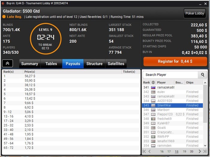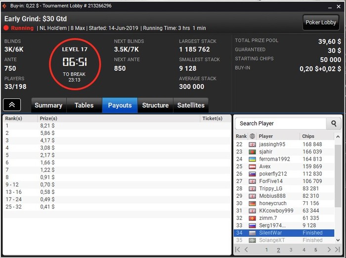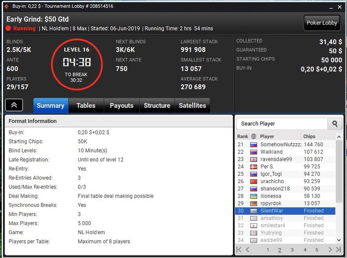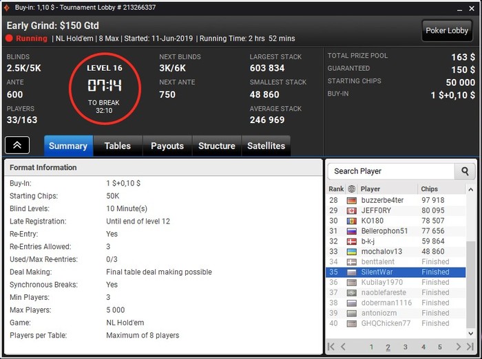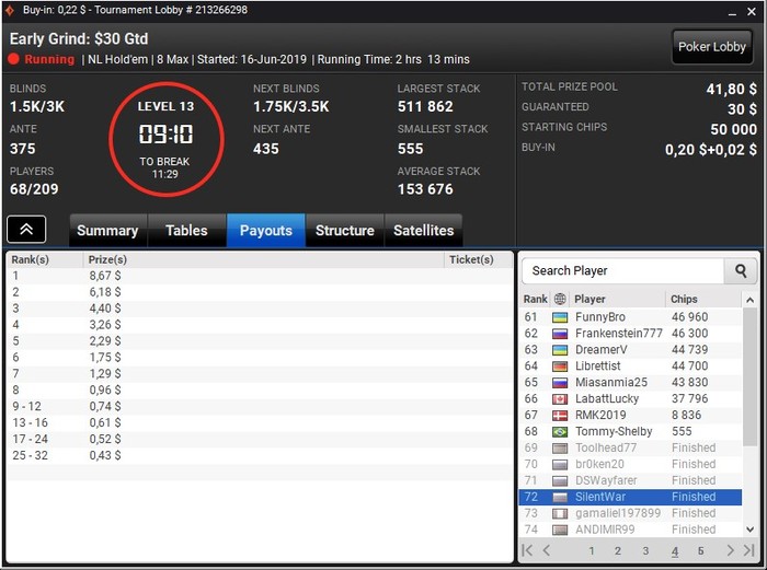 Что ж, удалось улучшить результат - 9 место)). Хотел первую финалочку оформить, но эпично вылетел QQ<KK. Эх, даже БР в плюс не вывел): -0,56 Результаты: