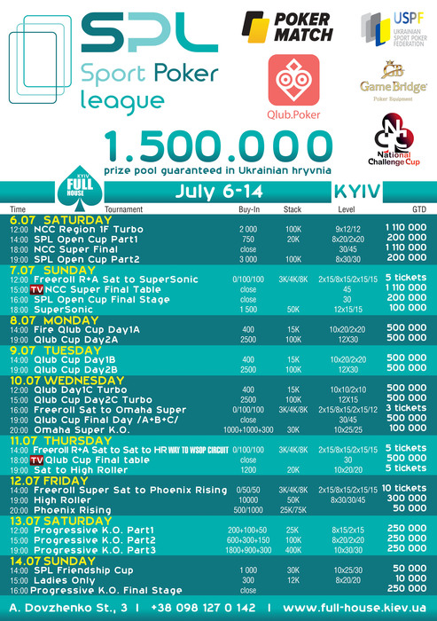 Праздник покера в рамках National Challenge Cup не завершится SuperFinal’ом! Уже 6 июля в клубе спортивного покера начнется масштабная серия Sport Poker League в рамках которой будет разыграно более 1.500.000 грн! С 6 по 14 июля вас ждут незабываемые покерные события серии Sport Poker League, в которых можно завоевать не только престижный трофей, но и побороться за солидные призовые. 6-7 июля состоится 2-этапный турнир-открытие серии SPL Open Cup с гарантией 200.000 грн! В воскресенье, 7 июля, все спортсмены, которые не сумели попасть на финальный стол National Challenge Cup или не прошли в финальную стадию SPL Open Cup смогут определить сильнейшего в турнире SuperSonic с гарантированным призовым фондом 100.000 грн. 8-11 июля вас ждёт насыщенный событиями и участниками турнир Qlub Cup с тремя стартовыми днями и различными уровнями бай-инов на разных этапах. Гарантированный призовой фонд турнира Qlub Cup – 500.000 грн! В четверг, 11 июля, в 18:00 стартует финальный стол турнира Qlub Cup и мы будем вести онлайн-трансляцию с открытыми картами. Кроме того, в четверг состоятся сателлиты к турниру хайроллеров! В пятницу, 12 июля, в 19:00 начнется турнир High Roller с гарантированным призовым фондом 300.000 грн! А в 20:00 вас ждёт турнир Phoenix Rising с демократичным бай-ином и гарантией 50.000 грн. Суббота, 13 июля – день прогрессивного нокаута! Все поклонники турниров с наградами за выбивание смогут сойтись в 3-этапном событии Progressive K.O., в котором будет разыграно не менее 250.000 грн призовых! В воскресенье, 14 июля, состоится турнир SPL Friendship Cup с гарантией 50.000 грн, специальный женский турнир Ladies Only, где будет разыграно не менее 10.000 грн призовых. А вишенкой на торте станет финальный этап турнира Progressive K.O., в котором оставшиеся спортсмены определят победителя!