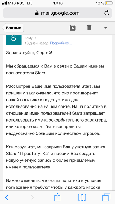 Wtf,наверно кто то нажаловался подумал я Ну лан оскорбляет кого то ну и оскорбляет поменяем делов то на 5 минут тем более саппорт утвердил мой новый ник и он не вызывает у них нареканий,отправил письмо и .....тишина
