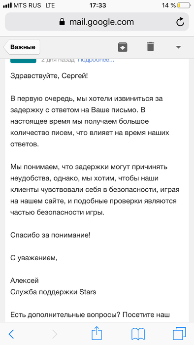 Ну ответа я не получил не через день ни через 5 и во. Спустя 11 дней приходит великолепный ответ