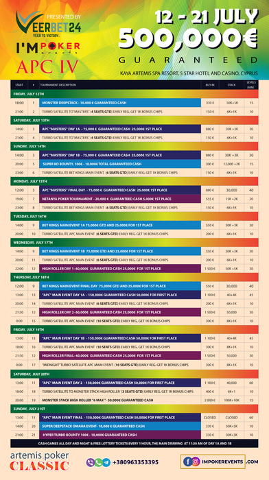 Всего несколько дней назад мы закончили наш Summer Cash Fest и уже на полной скорости спешим всех пригласить на нашу крупнейшую летнюю серию - ARTEMIS POKER CLASSIC IV с 12 по 21 Июля!! Гарантированный Призовой фонд - 500,000€!!
