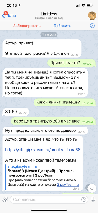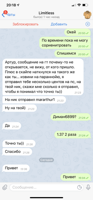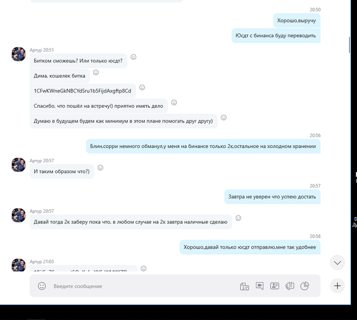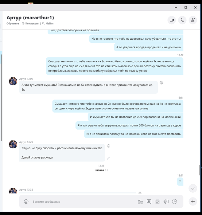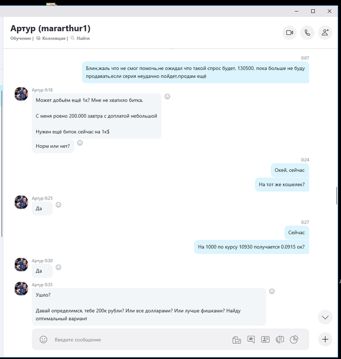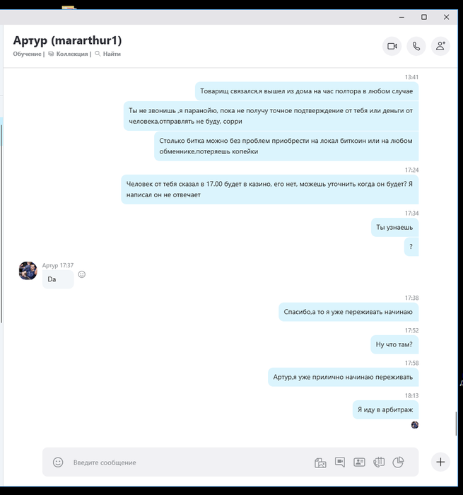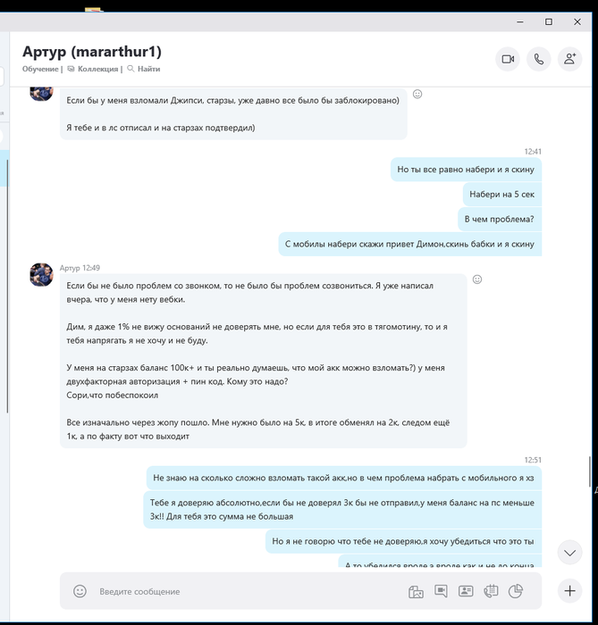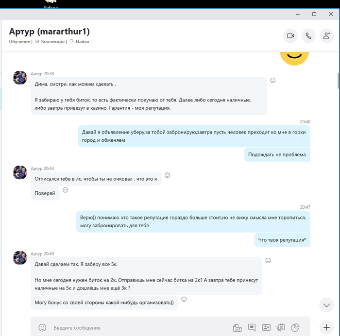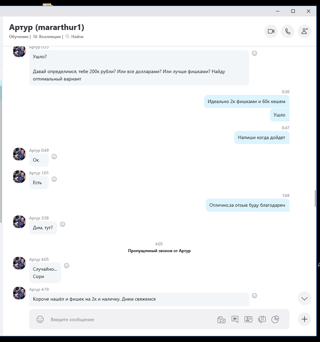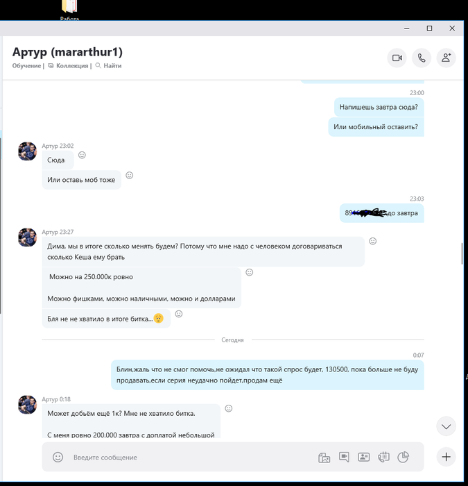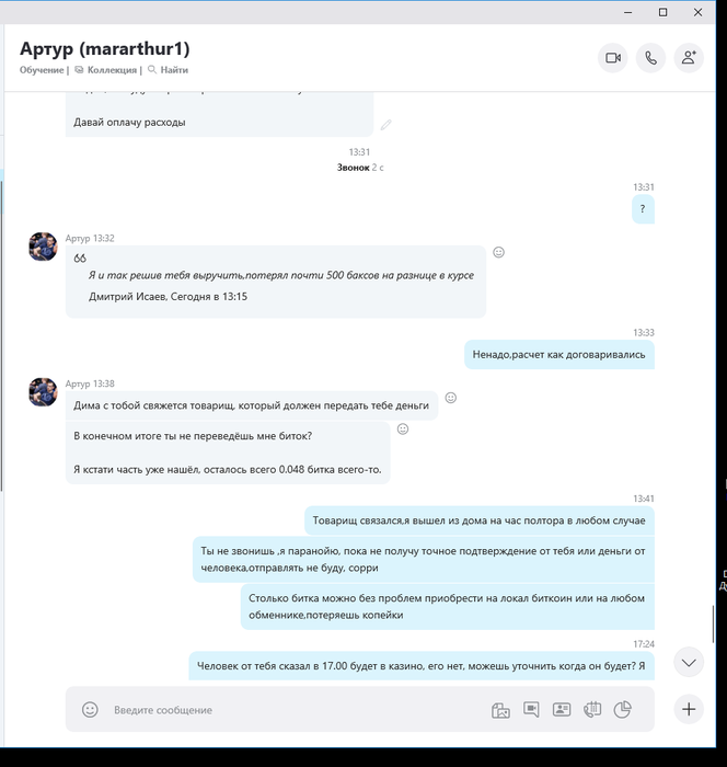 Вчера вечером мной было размещено объявление об обмене бтс на кеш в Сочи. Вечером в скайп написал Артур (mararthur1) попросил обмен. бтс просил перевести сразу, а деньги получить сегодня в 17.00 в казино Сочи, гарантия его репутация. Для подтверждения личности я попросил сделать видео звонок, он сказал что катает за компом без вебки. В качестве подтверждения написал сообщение на джипси и предложил перевести на пс рандомную сумму, он ее подтвердит, отправил 2 раза по 1.37$ в скайпе подтвердили. Денег мне сегодня не отдали, в скайпе отвечать перестали. Стал бы Артур кидать рандомного челика на 3к$ почти уверен что нет, возможно его кто то подвел, но почему перестал отвечать? Получается если третья сторона не может знать сумму перевода, значит ему взломали пс(а зачем вчера катали хайроллерскую сетку с его акка?). Я не понимаю. У кого есть связь с Артуром прошу связаться. Выкладываю полную переписку в которой можно убедиться в моих словах, под спойлер не знаю как убрать, просьба модераторов убрать