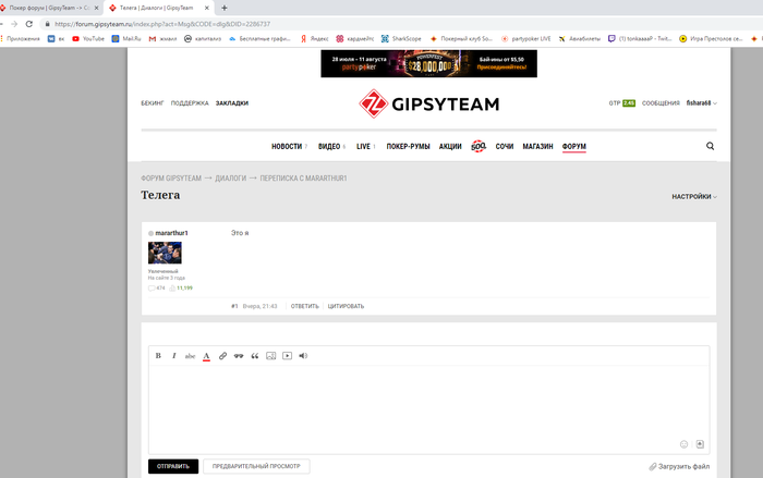 mararthur1, а мне нужно всего то было продолжить с тобой переписку на джипси...пиздец лол конечно, еще и на джипси написано телега..не знаю стоит ли перед тобой извиниться, я вроде тебя лично и не обвинял, думал взломали все