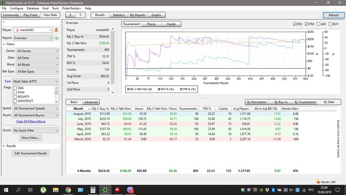 Привет, с покером знаком около 5 лет. Стартовал с МТСНГ за 0.5$ - набив бр катал нл25 (зум и обычные столы мсс/бсс) - затем спины (школа Vpluse). Сейчес катаю спины 5-7 лимит на старзах. Результаты с 1 июля (5 лимит,пул)