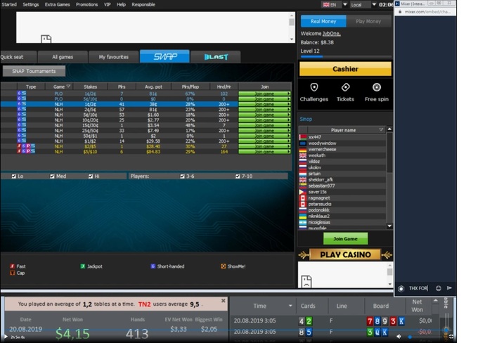 - Лимит и вид игры: NL2/ Snap (Holdem)