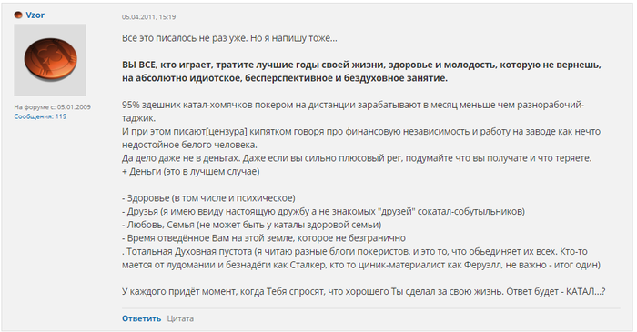 Три года ираю всьо подряд) .. По факту - мешу рейк и трачу время. Нравится МТТ, но нет времени, долго сидеть ночами. Работаю ..... есть 1-2 часа свобоных. Поетому либо кеш - либо Spin & go примерно 1 час в день тильтанул осталоь 40 $ на PS для банкрола.) Цель на ближайшее время - не розбить компютер. И достойно дозалить 40 баксов..