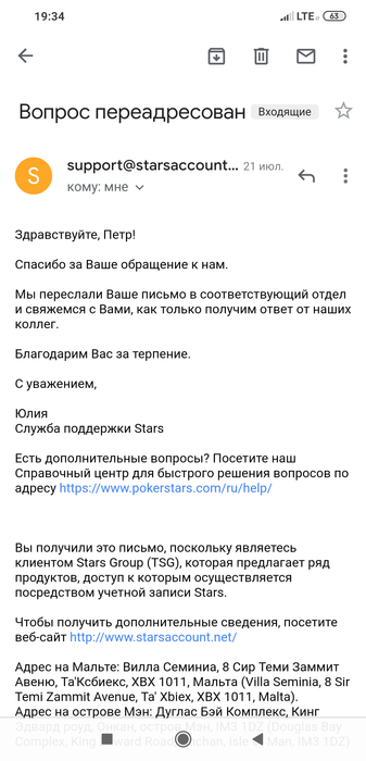 , а также support@pokerstars.com, и тоже безрезультатно, молчание и тишина, просто игнор, пробывал и на русском и на англ, ответ лишь был однажды на самое первое письмо от 21 июля,то есть месяц назад, ответ вида: