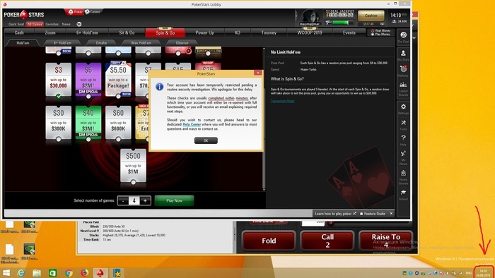 Всем привет дорогие коллеги! У меня произошла следующая ситуация, сижу себе катаю на старзах, никого не трогаю, как вдруг выплывает окошко, "Your account has been temporarily restricted pending a routine security investigation..." Соответственно ни в какой турнир ни в кеш сесть нельзя, выплывает это окно и игра на реальные деньги заблокирована. Кешаут делать не пыталась, но подозреваю что тоже нельзя (хотя неделю назад вывела 500 баксов и кешаут одобрили, деньги вывелись, и аккурат после этого выплыло это окошко и произошла блокировка. Правил не нарушала, хорошо с ними знакома. Никакого мульти-аккаунтинга или фичей вроде ботов или сговоренной игры не балуюсь, просто честно катаю. Вопрос к знатокам, возможно причиной данной проверки стал мой занос путевки (3300$ EPT open sochi 2019 - SAG) в spin & go. Выиграла её месяц назад, по просьбе сотрудников поддержки Pokerstars прислала все необходимые доки для верификации аккаунта, в ответ молчание уже 4 неделю (учитывая что серия в сочи стартует уже через месяц, а надо еще купить билеты на самолёт, + в сообщении (окошке) написано что проверка занимает минуты, а на деле несколько суток ничего не меняется, написала в поддержу (англоязычную) вежливый вопрос "Что происходит и почему я не могу играть"? -молчание уже сутки. Старзы в последнее время итак не радуют отсутствием рейк бека и прочими гадостями, а тут ещё это, нервы на пределе, нужно играть, отбираться на WCOOP, а я сижу и добиваюсь хоть какого ответа. Заранее всем спасибо, кто знает хоть что нибудь по этой теме и у кого есть опыт, расскажите пожалуйста.