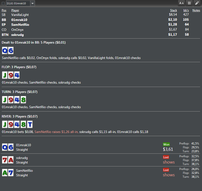 00kirill00 @ 3.9.2019 Играл без ХМ( сносил базу). Рук за столом было сыграно очень мало, примерно 20. Понимал что против меня два фиша и все.