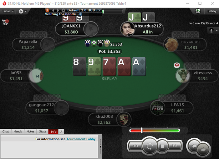 И так. Всё таки решил,что трехзначные цифры увеличивают мой аппетит и решил депнуть 50 баксов. Думал начать вечером,когда большое количество игроков,но были дела. Сейчас у меня 6 часов утра и я начал сессию пол часа назад. Крепкое кофе и хорошая музыка. Как сказала "homeY",я не удержался и из-за малого количества игроков в 45 макс я включил 4.4 баунти. Первая моя ошибка по этой игре была в том,что я зашел со средней позиции с 86о так,как человек до меня запушил свои 2.5 бб. В доску не попал в мутлипоте и отвалился на флопе,через несколько раздач я с АКо поставил трибет ,чипак с баттона запушил с АJo и с аппетитом взял мой баунти. Сейчас идет подключение 45макс.