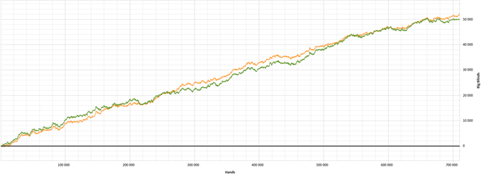 При этом непонятно как измерять прогресс, отмечать что ты понял что-то. Даже по самому простому пути (в смысле проверки) - игре чисто по солверу есть нюансы, а именно префлоп ренджи и применимость только к хедз-ап потам. Однако против любого человека есть более хорошие стратегии, которые эксплуатируют его. Но вот, например, ты поставил в блеф - и опп сфолдил. Был ли блеф хорошим? Может он был очень минусов, но ты попал в низ его ренджа? Может быть другой сайзинг был лучше? Может ты постоянно блефовал и теперь он резко перестроит стратегию и ты потеряешь возможность эксплойтить его? Сколько нужно ситуаций чтобы набрать репрезентативную выборку и статистически выяснить прибыльность, хотя бы при предположении неизменной игры оппа? Как мы можем объединять оппов или ситуации по степени схожести для определения этого?