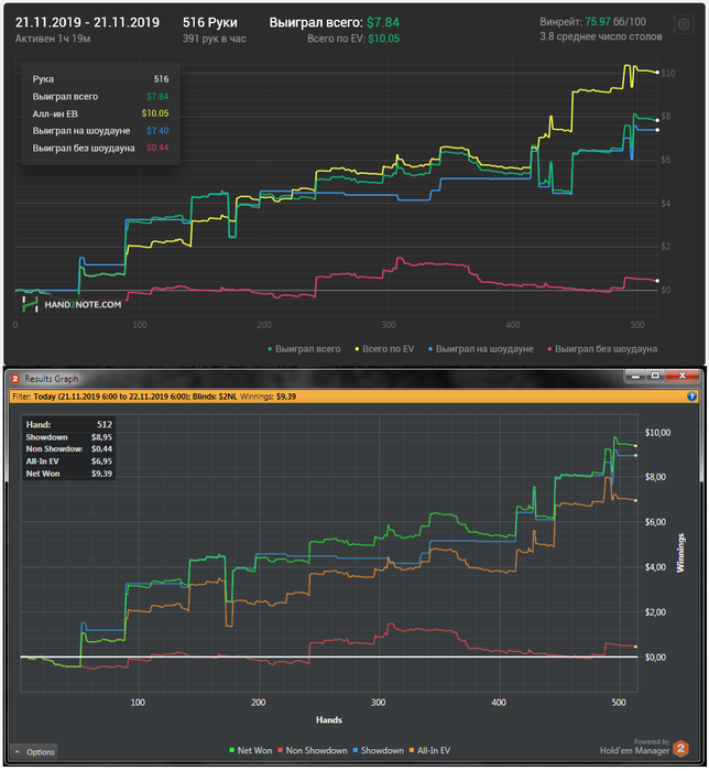 Встал выбор между трекерами, поэтому юзаю оба на данный момент, и отмечаю, что в игре приятнее иметь дело с H2N, а в работе с фильтрами привычнее всё же HM. Но не суть, у меня встал вопрос об одном конкретном случае, после короткой сессии, открыв графики, обнаружил несоответствие, выигрыш по EV и реальный поменяны местами, при чем график H2N отображает истину так как в конце действительно был небольшой недобор. Кто нибудь сталкивался, или это нормально, типа погрешность на небольшую дистанцию?