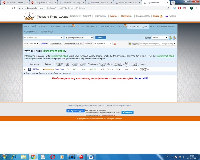 Закончился очередной день.С самого начала словил апчик + люто бамхантил (около 70 % игор с фишами),в итоге начал по 3,5 а потом играл и до 30 с фишами(пару игор),график за сегодня Кроме того нажил баксов 12 в кеш,и проиграл около 30 баксов в сатах на мтт,которые я каждый день играю,по 1-2 сату в надежде пройти на Bounty bilderі,в которых сладкие поля особенно в выходные. План на взавтра-играть 7,15 Plo HU Sng с гибким БРМ,по максимуму бамхантить и укреплять БР и пару сатов запустить на турики,+ еще больше концентрироваться во время игры,так как сегодня отдал байина 3 сыграв не туда совсем.Итак День 3 Бр на конец дня 185,87 888 покер 0,03 Сashout-0.