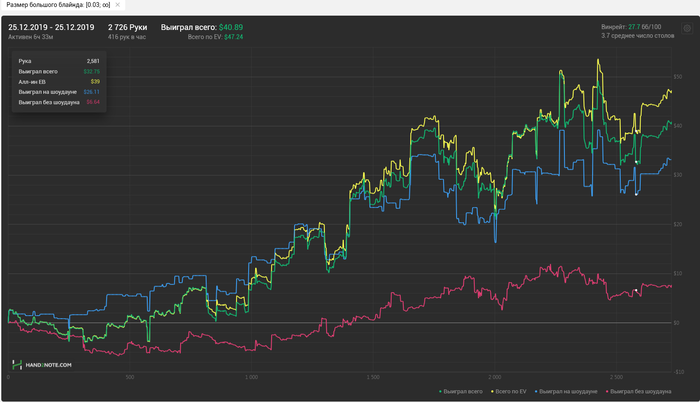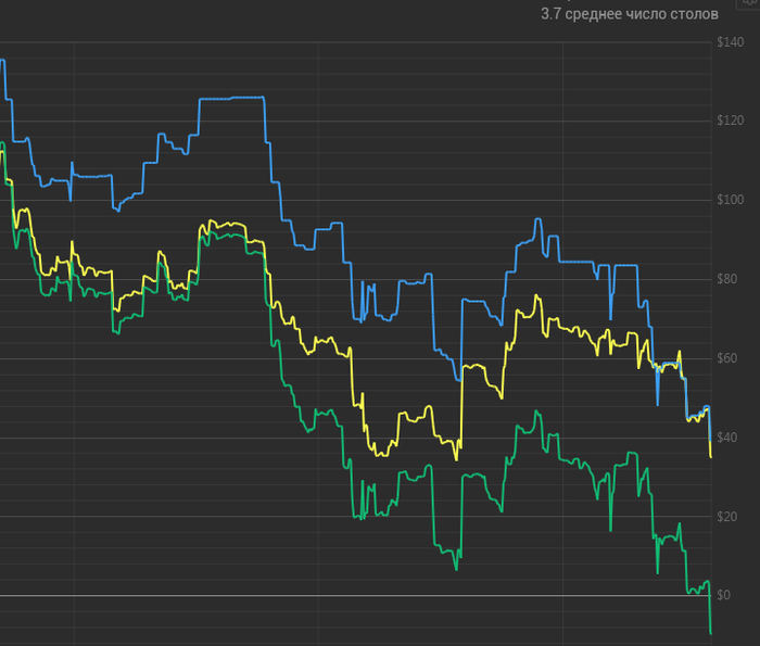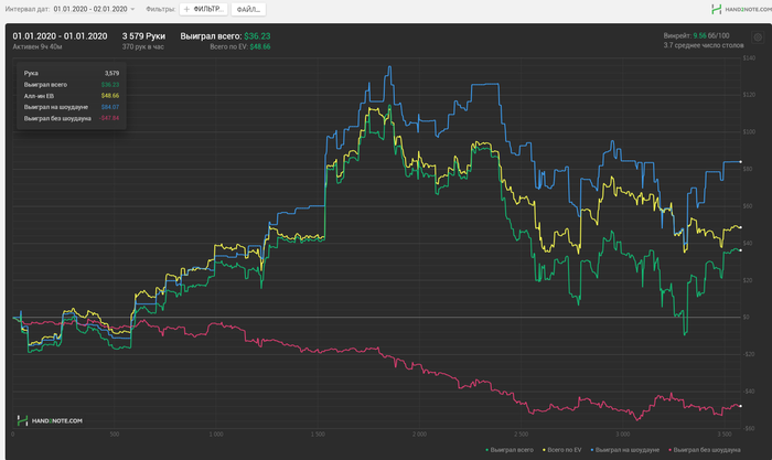 andreyka0603 @ 29.12.2019 YAWL, посоветовал бы тебе пока не наберешь 200$ хотя бы и дистанцию на нл5 в рук 30к, не играть на нл10. Пока по графикам тебя явно апает, поэтому когда тебя спустят с небес на землю будет больно падать.
