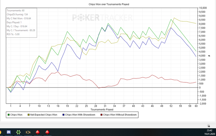 решил вчера покатать 5-ки и покопить EV, вначале шло все не плохо, отыграв около 60 турниров думал заканчивать но подумал еще чутка покатать и после пойти отдыхать, и тут меня поджидал просто звиздец, сделал пару ненужных колов и после этого уже не смог настроится на нор игру, в конечном итого вышло как то так