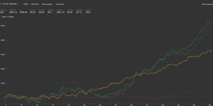 Рома, без обид, как есть. Ты типичный представитель ру комьюнити. Мало разбираешься в сути вещей, вырываешь из контекста вещи и громко орешь. 1.Мои графики на дистанцию 25к у тебя есть 2. Дистанция за прошлый мес смехотворна (-10к префлоп аллын, вот так мне сдавали, прибавь 20к фишек к моему резу, в среднем 12 фишек и хопа уже 70 фишек и что это значит, да тоже ничего на такой дистанции 3. Вот играю 10ки сейча с февраля... что ты скажешь по этому графику? Да тоже говорить тут нечего... Странно.. ты знаешь мой график, го я базу расшарю, поговори с моими учениками...зачем постить бред в 3к туров и писать дичь?
