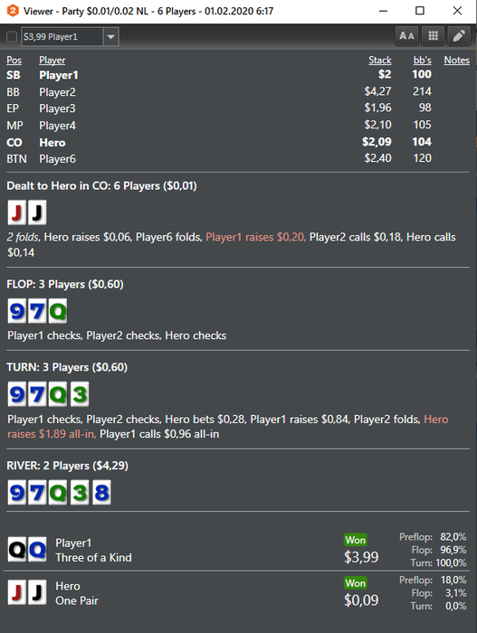 Забавная получилась вылазка. За первую сессию (6 часов и 4400 раздач) проиграл 120(-140 по ев), после чего чего решил что все совсем плохо и выделенных средств (300) хватит лишь на 2 сессии, а не на неделю как планировалось. Отдохнув пару дней решил поставить стоплосс на следующие сессии 40, немного скорректировал игру и приступил к следующей сессии. Следующие сессии оказались более удачными. Изначальный план наиграть базу на десятке за сумму в пределах 300 для дальнейшего разбора обернулся в плюс по ев с учетом выплаченного рейка 230. К воскресенью и вовсе заметил что привык к происходящему и скатился в автомат, возвращаться обратно в нл2 пока не планирую. Отличное начало на новом лимите.