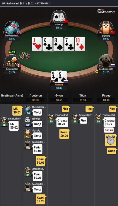 SB рег, BB в первый раз вижу. На терне решил что впереди, так как куча дров включая 2фд, мультипот и 4 чека. Как по мне 2 чека со стороны сб тут перебор, что думаете? b/f терн или всем дружно чекать до шд?