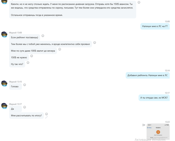 Однозначно мошенник. Тоже пытался 13 февраля меня кинуть на деньги. До этого уже был с ним один успешный обмен. Видимо для того, чтобы попробовать втереться в доверие. Писал мне со скайпа - live:.cid.cf507b35720ac75b Skrill - jarkiyalex@yandex.ru (Alexey Kuznetsov) Фейк на ГТ - AlexEvPlus
