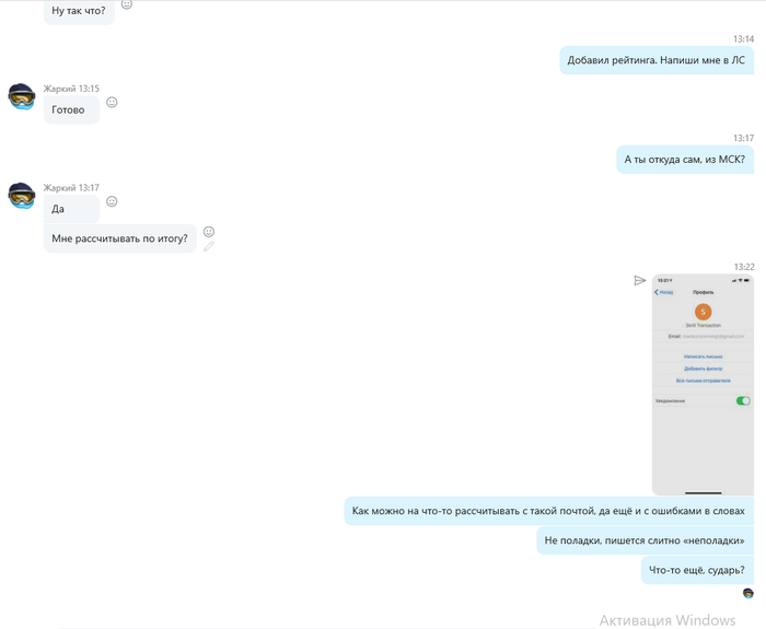 petan @ 6.3.2020 Если кратко - 12 февраля ты договорился в телеграм об обмене скрилл на яд с TransDominator, с которым я сотрудничаю, прислал левые письма о переводах на скрилл (тут мой косяк, я не проверил фактический приход денег), получил свой яд и скрылся в темноте. На следующий день, 13 февраля, ты написал мне с той же телеги, представившись другим участником форума и также пытался развести на обмен, правда здесь я вовремя понял неладное, попросил тебя отписать мне в личку на ДТ и ты удалив всю переписку исчез. И вот, спустя две недели, ты мне написал с этого же телеграм!!! с просьбой о предоставлении займа, такой фэйспалм, похуже моего.