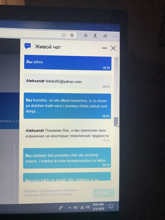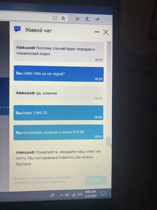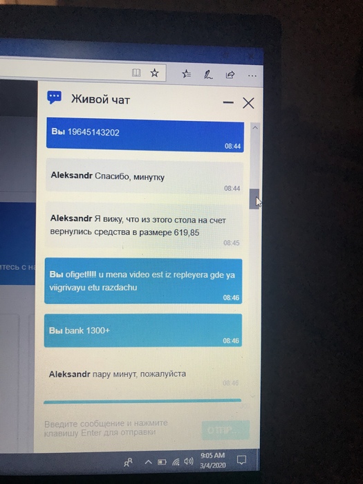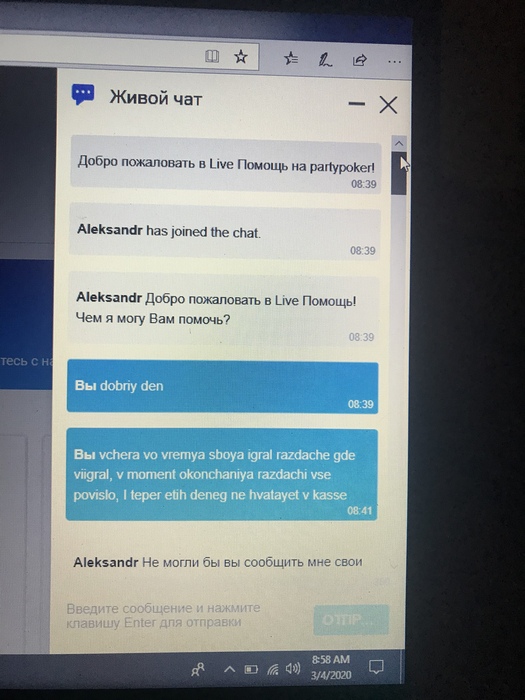Сама ситуация: 3 марта я играл сессию на Пати, за столом PLO500 принял участие в раздаче, на начало которой у меня в стеке ~619$. В данной раздаче я выставляюсь на флопе за банк ~1350$, открывается весь борд, открываются карты оппонента, моя рука победная, берется рейк и все виснет. Я пишу в онлайн чат первый раз(скрины ниже), где оператор ПОДТВЕРЖДАЕТ мне что видит мою раздачу и ее результат, и переправит мою проблему в технический отдел. На следующий день на почту получаю письмо в котором говориться что раздача была признана «игрой с неправильной сдачей» и мне вернули изначальные ~619$ на счет. Я с этого офигеваю, и пишу в онлайн чат второй раз(если нужно будет, скрины приложу позже). В этот раз оператор несет бред, говорит что не видит что мне отправляли какое-либо письмо и тд. Дальше я лично отсылаю письмо в поддержку с требованием решить эту ситуацию, на что получаю «ваш вопрос направлен в спец отдел, ждите». Пошел уже четвертый день, оптимизма не прибавляется. Все скрины общения и ВИДЕО ЗАВЕРШЕННОЙ РАЗДАЧИ из реплейера есть, буду выкладывать по мере необходимости.
