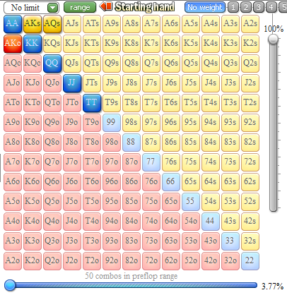chup, не увидит он чисто статистически чаще АК, т.к. самые отбитые ниты, во-первых, их не всегда и 3-бетнут против ранней, во-вторых запушат только в тильте в условных 1-2% случаев(мб чуть утрировано), ну и, в-третьих, мы их блочим наглухо своими КК. Там перекос в сторону АА конкретный по линии 3-бет/пуш vs ранней, дам было бы странно все 6 комб задавать ему в диапазоне такого пуша - 1-2 из 6 от силы, с натяжечкой, и 4-5 были бы в колле 4-бета, а мб и фолде, я бы сказал там максимум 1 комба АК из 8 возможных, ну пусть 2 - дам, 1 - КК, 6 - АА. Тут эквити в уме считается, а вернее его фактическое отсутствие у нас. На 6-максе даже, в лузовых чартах, если что, 4-бет с ранней это КК+(с некоторыми руками для блефа, конечно, но минимумом), против не нитов, а типа сбалансированных регов с блеф-диапазонами 3-бета, а вы дам ему задаёте, НИТУ, на фулл-ринге, а тем более АК
