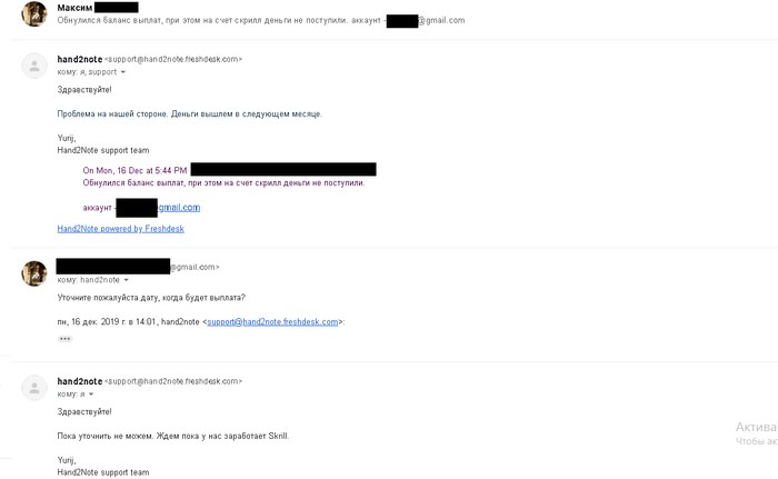 Возникла достаточно странная и неприятная ситуация с выплатами комиссий за привлечение лидов для Hand2Note. Начали приходить письма, что ваша комиссия выплачена на Skrill при этом деньги с аффилействкого счет списываются, а на скрилл не доходят. После письма в саппорт проблема решалась. В ноябре-декабре 2019 снова произошла подобная ситуация, но моего письма в саппорт начались кормления завтраками и отмазы в стиле данной ветки, проблемы со скриллом, выплатим в следующем месяце. После письма о том, что я освещу данную ситуацию на тематических форумах, предложили вариант с PayPal, однако он мне не подходит из-за того, что в Украине его функционал очень сильно ограничен, и получить деньги на счет не нарушая правил системы я не смогу. На это письмо он и вовсе не отреагировали.