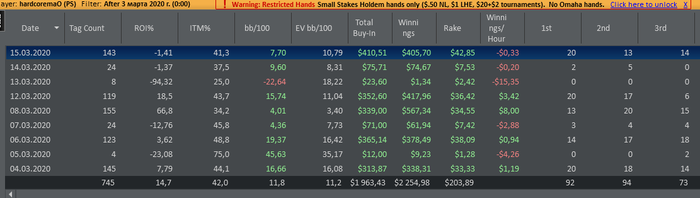 Вот небольшие результаты за 2 дня, сегодня тоже сяду катать. Много интересных раздач было против регов. Заметил кучу ликов у себя против них и начал потихоньку подстраиваться. Более вдумчиво начал играть, если остаюсь в топ - 3 с регами. Также заметил, что на тройках мало кто соображает в постфлопе, что не может не радовать!