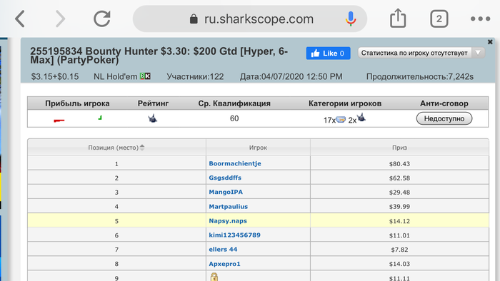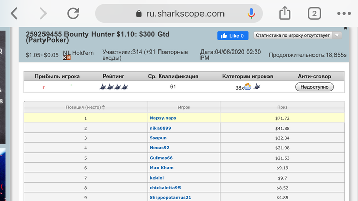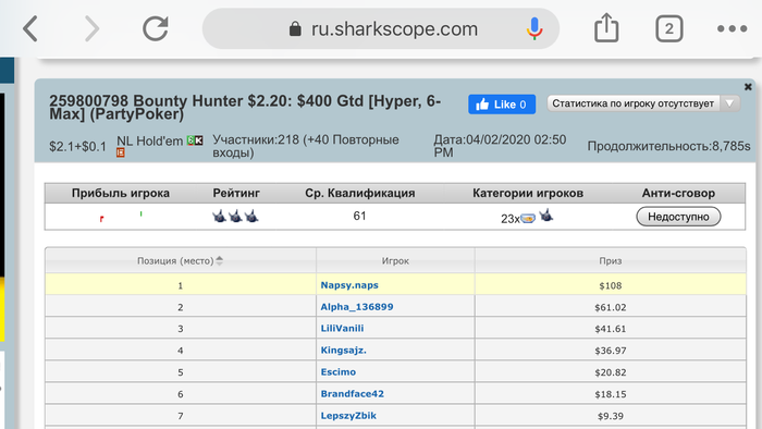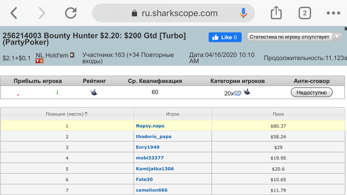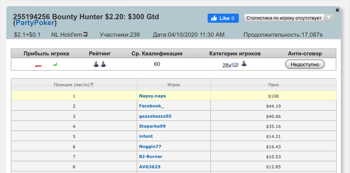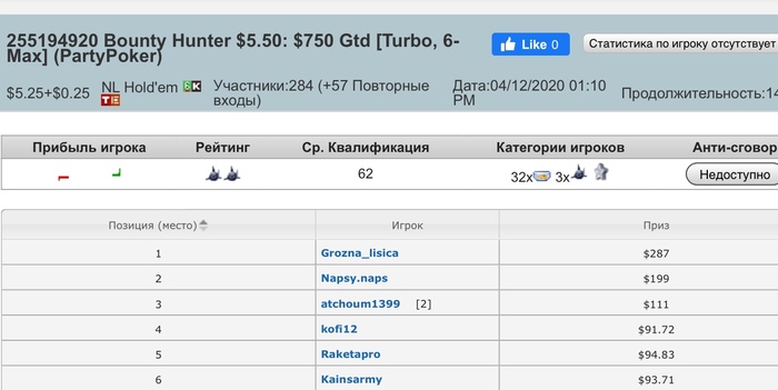 Хорошие результаты за последние несколько дней, но два раза не повезло в хедзапе. Но хорошие вторые места. Дальше больше. Было несколько спорных раздач. Пытаюсь разобраться и думаю, что в следующий раз сыграю по другому.